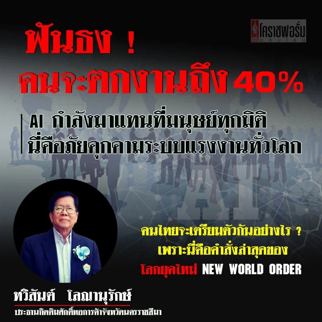 เป็นประเด็นข่าวที่น่ากังวล เมื่อกองทุนการเงินระหว่างประเทศ (IMF) ออกมาเตือนว่าปัญญาประดิษฐ์ หรือ AI จะเข้ามาแทนที่มนุษย์ในเกือบทุกมิติแล้ว และทำให้แรงงานทั่วโลกตกงานเฉลี่ยถึง 40% นี่คือภัยคุกคาม “ทวิสันต์ โลณานุรักษ์” ประธานกิตติมศักดิ์หอการค้าจังหวัดนครราชสีมา เขียนบทความ แสดงทัศนะเป็นห่วง คนไทยจะเตรียมตัวรับมือกับสถานการณ์ดังกล่าวอย่างไร ?