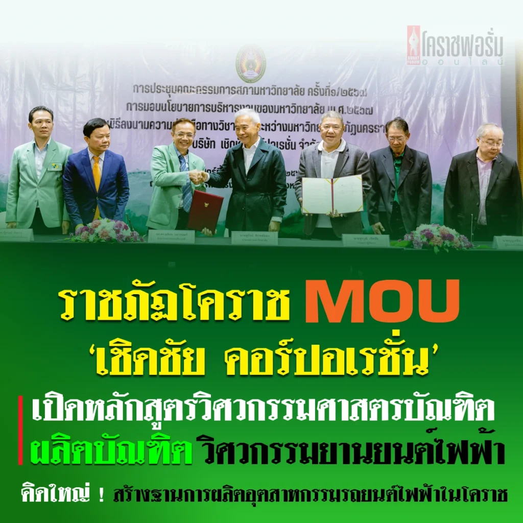 โดยการจัดทําหลักสูตรวิศวกรรมศาสตรบัณฑิต สาขาวิชาวิศวกรรมยานยนต์ไฟฟ้า จัดการเรียนการสอนในรูปแบบการเรียนระหว่างสถาบันอุดมศึกษาและสถานประกอบการ (CWIE : Cooperative and Work Integrated Education) ระหว่างมหาวิทยาลัยราชภัฏนครราชสีมา กับ บริษัท เชิดชัยคอร์ ปอเรชั่น และร่วมกันในการวิจัยพัฒนานวัตกรรมเพื่อยกระดับคุณภาพการจัดการศึกษาและต่อยอดนวัตกรรมและงานวิจัยสู่การพาณิชย์ในกรอบระยะเวลา 5 ปีการศึกษา นับตั้งแต่ปีการศึกษา 2567 ถึง ปีการศึกษา 2571 การลงนามบันทึกข้อตกลงความร่วมมือครั้งนี้ เป็นส่วนสนับสนุนให้ ประเทศไทยเป็นศูนย์กลางยานยนต์ไฟฟ้า รองรับตลาดยานยนต์ที่มีการปรับตัวของโลกต่อไปในอนาคต