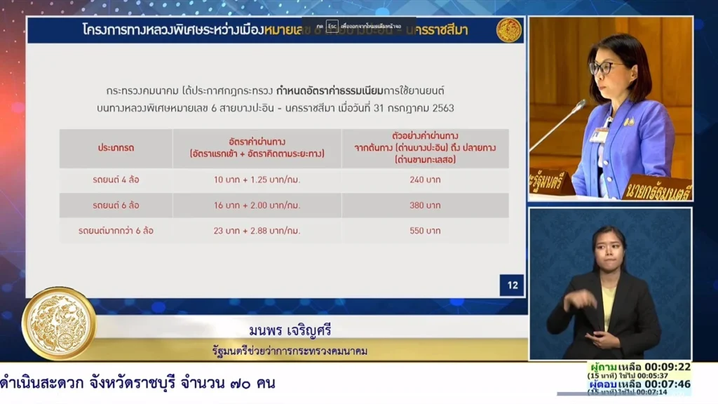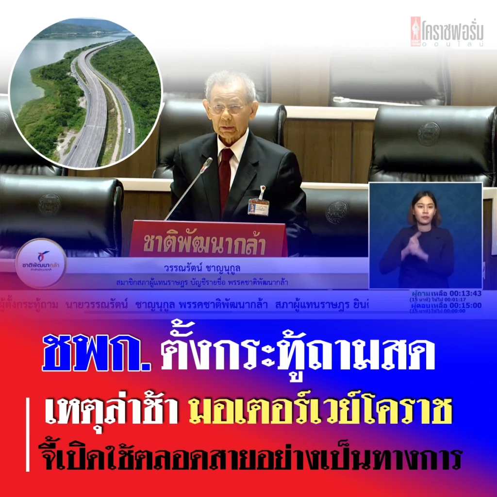 นพ.วรรณรัตน์ฯ สส.บัญชีรายชื่อ พรรคชาติพัฒนากล้า กระทู้ถามสด ติดตามประเด็นความล่าช้าก่อสร้างโครงการมอเตอร์เวย์สายบางปะอิน-โคราช และกำหนดเปิดเป็นทางการ เผยบางช่วงสภาพผิวจราจรไม่ได้คุณภาพ รวมทั้งอัตราค่าบริการที่เรียกเก็บสูงไป อาจกระทบประชาชน
