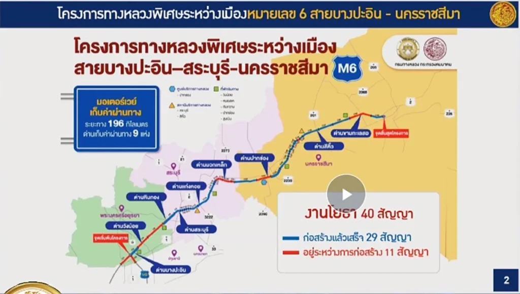 ด้านนางมนพร เจริญศรี รัฐมนตรีช่วยว่าการกระทรวงคมนาคม ตอบกระทู้ถามสดความคืบหน้าโครงการทางหลวงพิเศษระหว่างเมืองหมายเลข M 6 สายบางปะอิน-นครราชสีมา ระยะทาง 196 กม.ว่าแบ่งเป็นงานโยธาสําหรับก่อสร้าง 40 สัญญา งานระบบที่ด่านเก็บค่าธรรมเนียมผ่านทางทั้งสิ้น 9 ด่าน 1 สัญญา ปัจจุบันมีความก้าวหน้างานโยธาก่อสร้าง จํานวน 29 สัญญา และอยู่ในระหว่างการก่อสร้างทั้งสิ้น 11 สัญญา โดยให้ก่อสร้างแล้วเสร็จทุกสัญญาภายในเดือนธันวาคมปี 2568 โดยมีเป้าหมายสามารถที่จะเปิดทดลองให้บริการฟรีตลอดเส้นทางในช่วงเทศกาลปีใหม่ถึง 2569 และพร้อมที่จะเปิดให้บริการเต็มรูปแบบและเริ่มเก็บค่าผ่านทางใน ช่วงต้นปี 2569