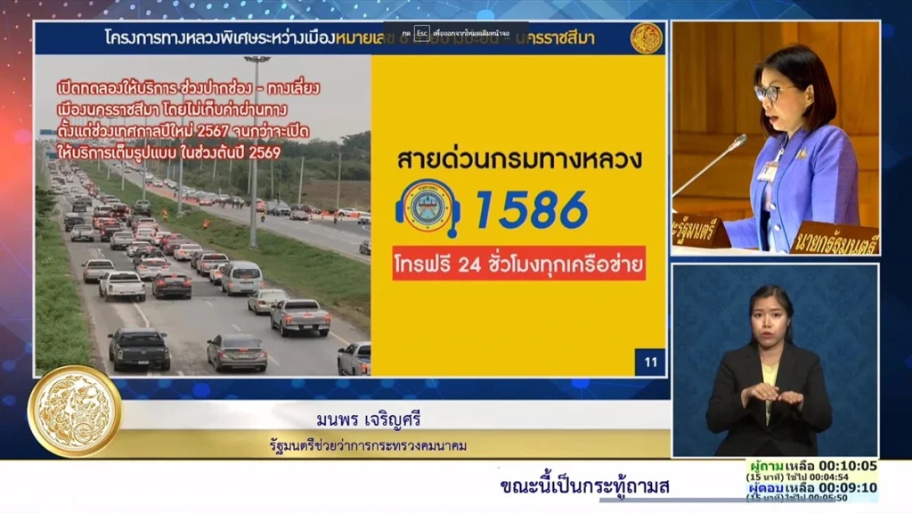 1.ความล่าช้าของการก่อสร้างของโครงการนี้เกิดขึ้นเพราะเหตุใด และในขณะนี้มีความคืบหน้าไปถึงไหนแล้ว การที่กระทรวงคมนาคมได้เปิดใช้งานบางส่วน ในช่วง ปากช่อง-นครราชสีมา โดยไม่เก็บค่าผ่านทางจนกว่าการก่อสร้างจะแล้วเสร็จสมบูรณ์นั้นถือว่าประชาชนได้รับประโยชน์ และได้รับความสะดวกมากในระดับหนึ่ง และถามว่าจะเปิดให้บริการประชาชนได้อย่างครบถ้วนสมบูรณ์เมื่อใด จะเสร็จทันภายในปี 2567 นี้หรือไม่