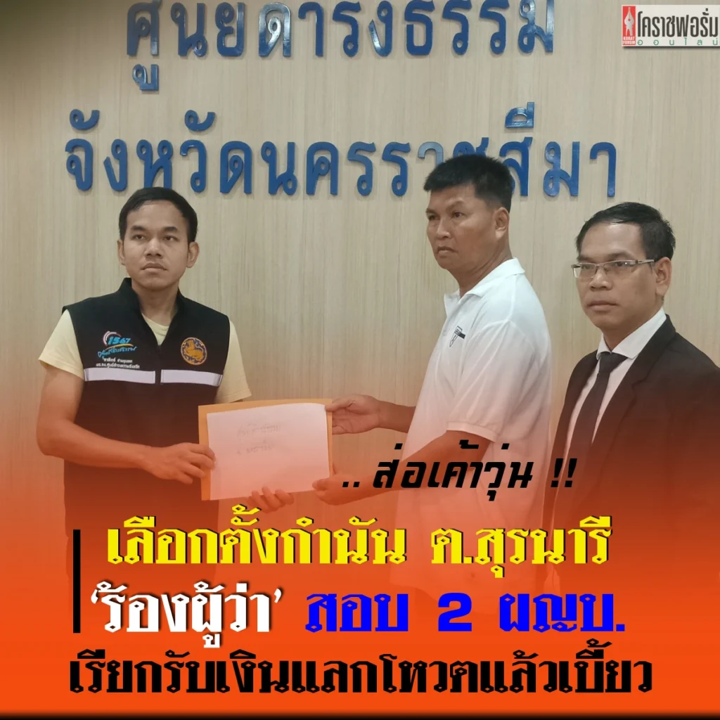 เลือกตั้งกำนันตำบลสุรนารี ส่อเค้าวุ่น “ผญบ.หมู่ 5 บ้านหนองบง” ว่าที่ผู้สมัครฯ ร่วมกับทนาย บุกยื่นหนังสือร้องผู้ว่าฯ ผ่านศูนย์ดำรงธรรมจังหวัดนครราชสีมา ให้สอบผู้ใหญ่บ้าน 2 ราย หลังเรียกรับสินบนล่วงหน้าคนละ 1 แสนบาท เพื่อแลกโหวตสนับสนุนเลือกตั้งกำนันแล้วเบี้ยว