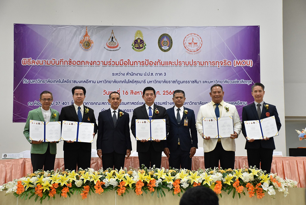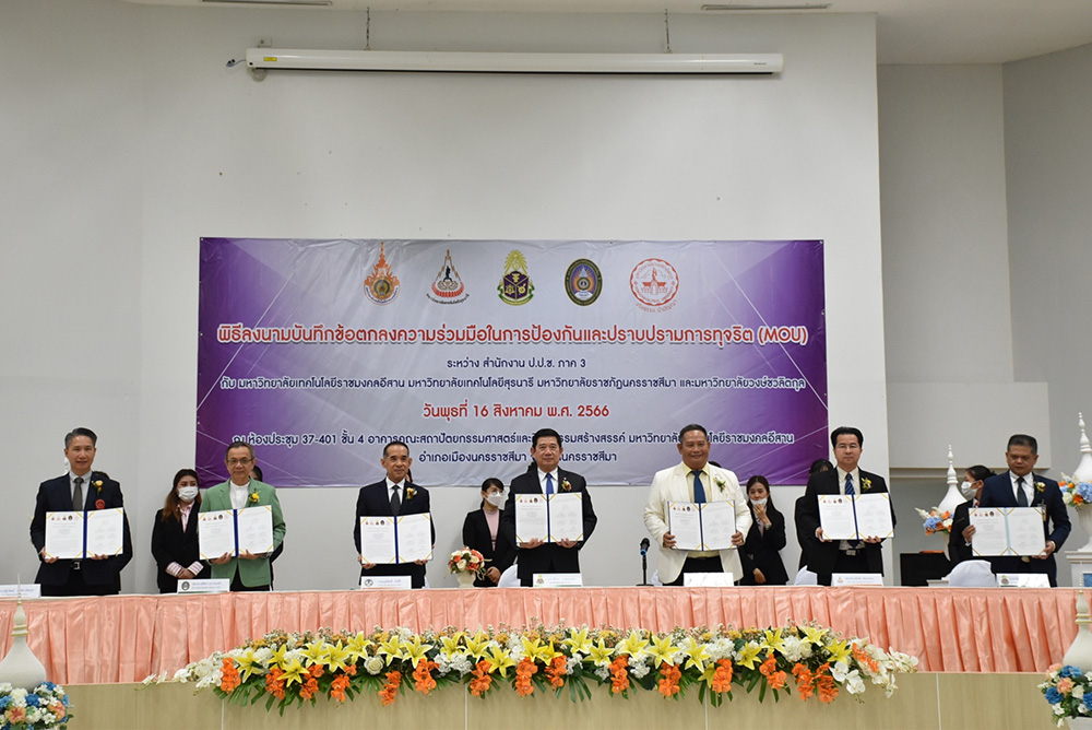 วันนี้ 16 สิงหาคม 2566 เวลา 09.30 น.ที่ห้องประชุม 37-401 ชั้น 4 อาคารคณะสถาปัตยกรรมศาสตร์และศิลปกรรมสร้างสรรค์มหาวิทยาลัยเทคโนโลยีราชมงคลอีสาน จังหวัดนครราชสีมา นายปริญญา วิกุลศิริรัตน์ ผู้อำนวยการสำนักงาน ป.ป.ช. ประจำจังหวัดนครราชสีมา ร่วมกิจกรรมเป็นสักขีพยานในการจัดทำบันทึกข้อตกลงความร่วมมือในการป้องกันและปราบปรามการทุจริต (MOU) ระหว่างสำนักงาน ป.ป.ช. ภาค 3 กับ 4 มหาวิทยาลัยประกอบด้วย มหาวิทยาลัยเทคโนโลยีราชมงคลอีสาน มหาวิทยาลัยเทคโนโลยีสุรนารี มหาวิทยาลัยราชภัฏนครราชสีมาและมหาวิทยาลัยวงษ์ชวลิตกุล โดยมีนายนิวัติไชย เกษมมงคล เลขาธิการคณะกรรมการ ป.ป.ช. เป็นประธานในพิธี ร่วมจัดทำข้อตกลงกับ อธิการบดีมหาวิทยาลัยทั้ง 4 แห่ง รวมถึงแขกผู้มีเกียรติร่วมเป็นสักขีพยาน อาทิ นายภูมิสิทธิ์ วังคีรี รองผู้ว่าราชการจังหวัดนครราชสีมา ผู้อำนวยการสำนักงาน ป.ป.ช. ประจำจังหวัด ในเขตพื้นที่ภาค 3 ผู้ทรงคุณวุฒิด้านการศึกษา สื่อมวลชนและนิสิตนักศึกษา ประชาชน เป็นต้น