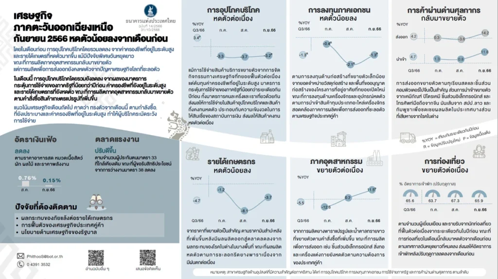 แบงค์ชาติอีสาน แถลงข่าวภาวะเศรษฐกิจการเงินภาคตะวันออกเฉียงเหนือ เดือนกันยายน 2566 สรุปสาระสำคัญ กิจกรรมทางเศรษฐกิจหดตัวน้อยลงจากเดือนก่อน การอุปโภคบริโภคโดยรวมยังลดลงหดตัวต่อเนื่อง จากผลของมาตรการกระตุ้นการใช้จ่ายของภาครัฐที่น้อยกว่าปีก่อน ค่าครองชีพยังอยู่ในระดับสูง และรายได้เกษตรกรยังหดตัว การผลิตภาคอุตสาหกรรมกลับมาขยายตัว ตามคำสั่งซื้อสินค้าเกษตรแปรรูปที่เพิ่มขึ้น แนวโน้มเศรษฐกิจเดือนถัดไป คาดว่า ทรงตัวจากเดือนนี้ ตามกำลังซื้อที่ยังเปราะบางและค่าครองชีพที่อยู่ในระดับสูง ทำให้ผู้บริโภคระมัดระวังการใช้จ่าย